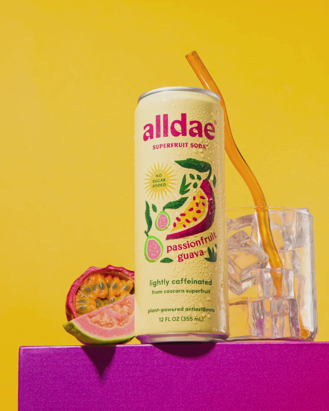 Say goodbye to artificial energy and hello to alldae. Our Passionfruit Guava superfruit soda brings you the bold, juicy flavor of real fruit with a gentle boost from upcycled coffee fruit (a.k.a. cascara)—no sugar added, no weird stuff. It’s refreshingly tart, subtly sweet, and perfectly balanced to power your afternoons with a pop of feel-good fizz. It’s soda—but smarter.